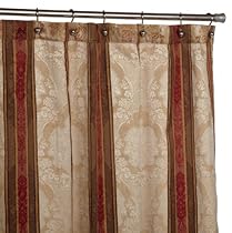 - Shower curtain has red and chocolate stripes with a classic jacquard gold overlay on a champagne ground